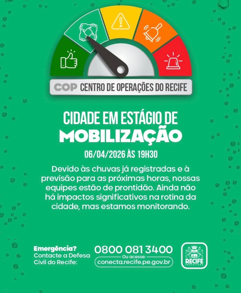 Diante da previsão de chuvas com intensidade moderada a forte nas próximas horas, a Prefeitura do Recife entrou em Estágio de Mobilização. Com isso, a população deve ficar atenta e acionar a Defesa Civil, a qualquer momento, em caso de necessidade, pelos telefones 0800-0813400 e 3036-4873, além de consultar os canais oficiais da PCR. O Centro de Operações do Recife (COP) já está mobilizado e as equipes da Defesa Civil entraram em prontidão.